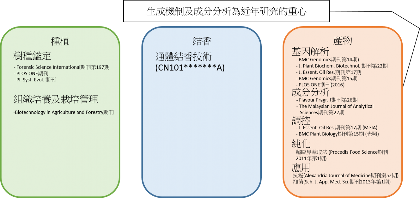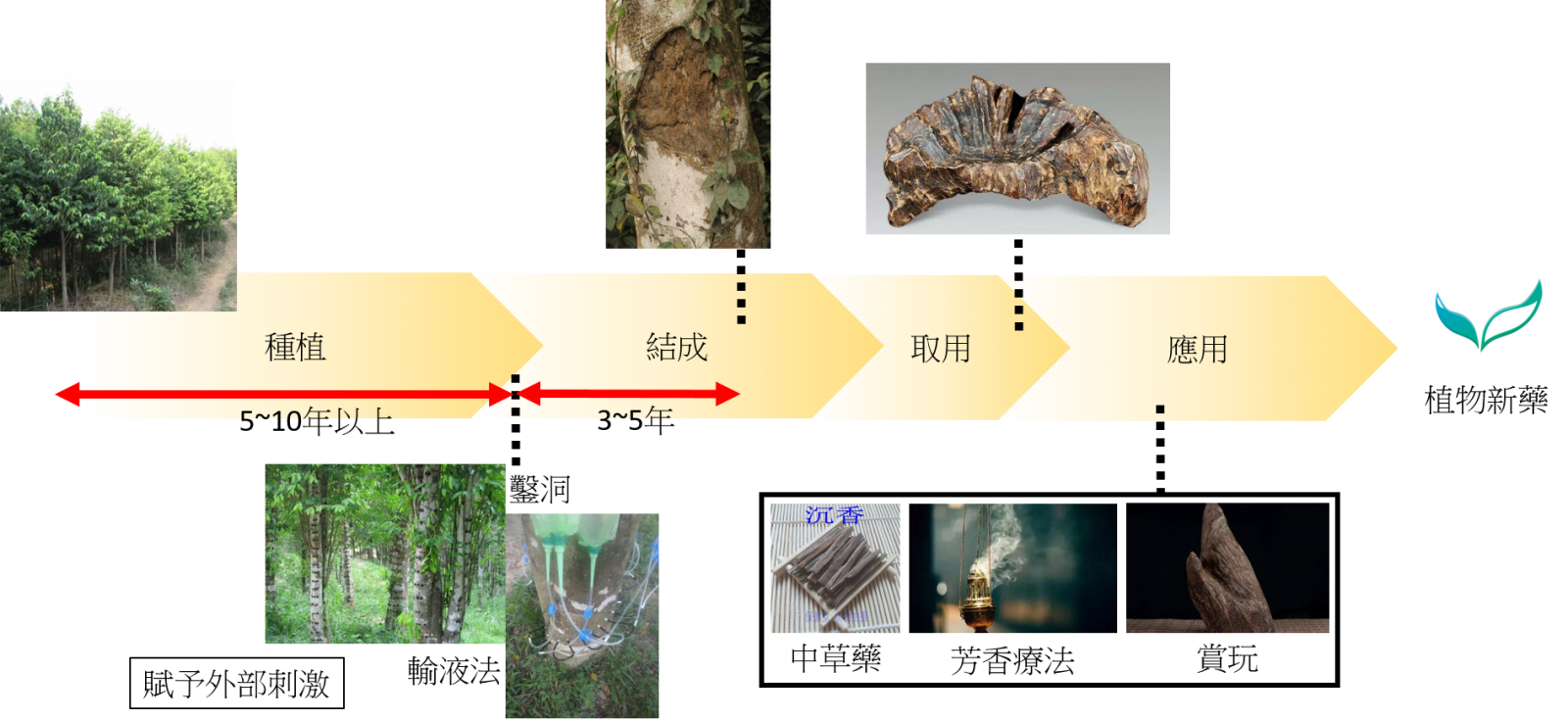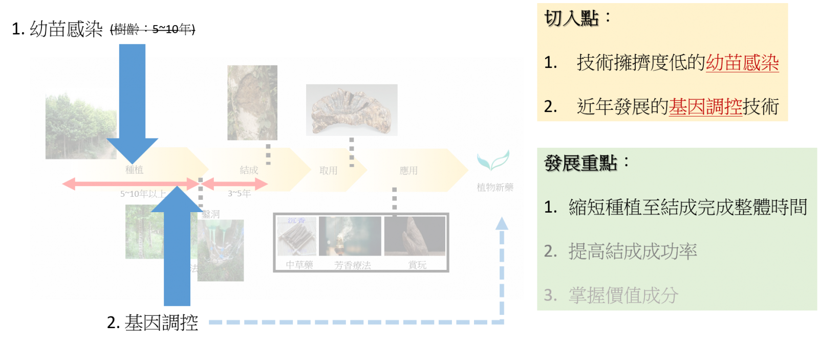 從幼苗時期起透過,透過真菌感染或基因調控技術,控制植物特定物質之分泌,縮短植物形成特定物質時程,降低生產成本。
